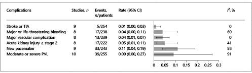 Meta-analysis of secondary outcomes. Bar graphs show the pooled event rate and relative 95% confidence interval (CI) (horizontal lines) for the secondary outcomes. Explanation of the I2 statistic is reported in the legend of Figure 2. TIA, transient ischemic attack; PVL, paravalvular leak.