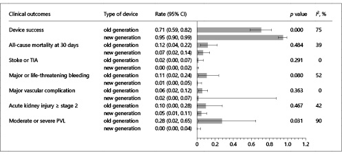 Comparison of clinical outcomes between old- and new-generation THV devices. Bar graphs show the pooled event rate and relative 95% confidence interval (CI) (horizontal lines) for the clinical outcomes. Explanation of the I2 statistic is reported in the legend of Figure 2. TIA, transient ischemic attack; PVL, paravalvular leak.