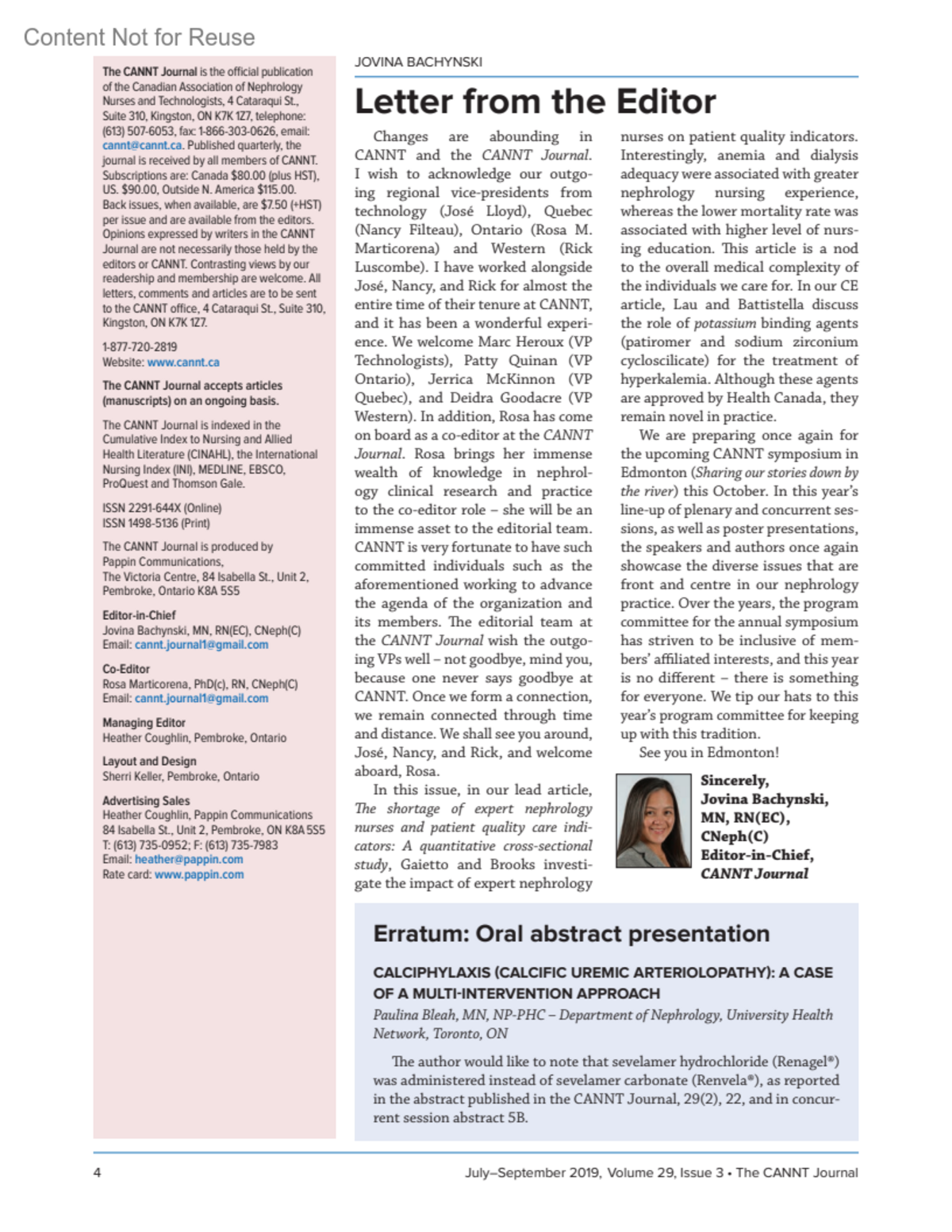 Erratum: Oral abstract presentation CALCIPHYLAXIS (CALCIFIC UREMIC ARTERIOLOPATHY): A CASE OF A MULTI-INTERVENTION APPROACHBleah, Paulina MN, NP-PHCAuthor informationDepartment of Nephrology, University Health Network, Toronto, ONCANNT Journal 29(3):p 4, July-August-September 2019.Copyright © CANNT