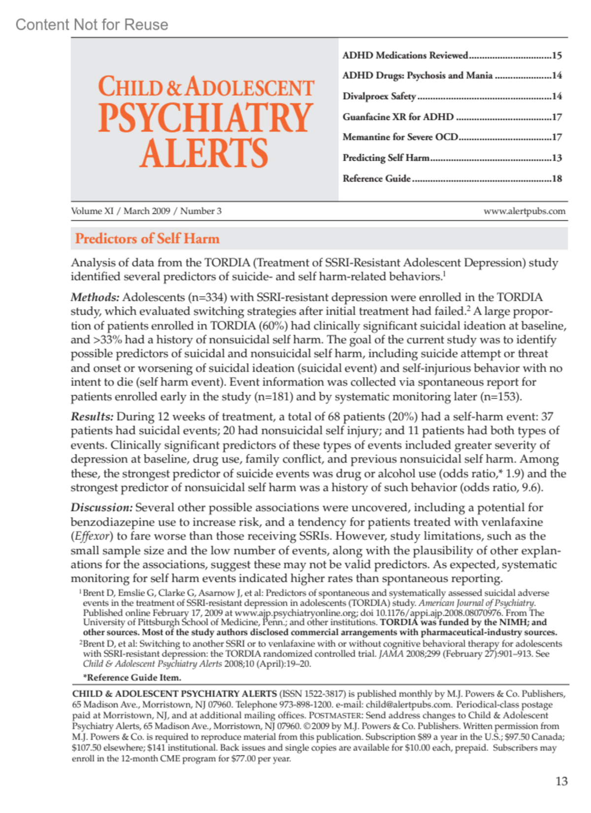 Predictors of Self HarmChild & Adolescent Psychiatry Alerts 11(3):p 13, March 2009.Copyright ©2009 M. J. Powers & Co. Publishers