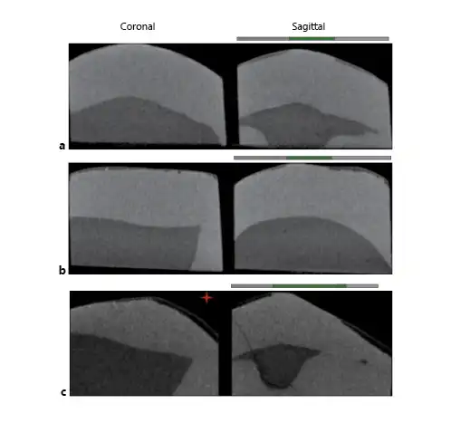 Samples were scanned by 3-dimensional X-ray micro-CT (Skyscan 1,172, Bruker MicroCT, Kontich, Belgium) along with a reference standard (1-mm thick aluminum wire of high purity >99.999%; Sigma-Aldrich, St. Louis, USA) and linear attenuation coefficient of 0.767326/cm. For image acquisition, a 4.88-μm pixel, 100-kV voltage (a peak emission energy of 59 keV; according to the manufacturer), a 100-μA amperage, 180°-rotation, 3-frame average, 0.5°-rotation pitch, and AlCu filter were used. The images were reconstructed and converted to bitmap by nRecon software v1.5.23 with 10-smoothing, 18-ring artifact reduction and 25% beam-hardening. The images were aligned with the DataViewer morphometric visualization software (Bruker MicroCT). One 2-dimensional (2D) image was extracted from each of the 3 studied locations of the specimen, i.e., the occlusal (500 μm from the occlusal side), cervical (500 μm from the cervical side), and middle thirds. From each 2D image, 2 areas (left and right to the internal control) were analyzed, totaling 6 areas analyzed per sample (Fig. 1, sagittal view). The left and right outcomes were averaged and considered for the statistical analysis. The presence of wear facets was determined using 2D images in DataViewer software (Bruker MicroCT). The facets had a flat appearance (Fig. 1c). The anatomical location and the side where the wear facet was observed were tabulated and used in the data analysis.