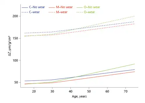 The ΔZ in the cervical third was significantly higher than the middle and occlusal thirds for younger teeth (15 and 30 years). Inverse results were observed starting at the age of 40 years and, at the age of 75 years, the ΔZ in the cervical third was still higher than the middle third but lower than the occlusal third. The occlusal and middle thirds were not significantly different at younger ages, but the difference increased with age and became significantly higher in the occlusal third at the age of 75 years.
