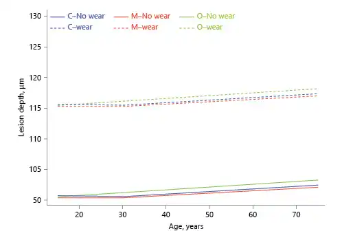 The dental age of 261 human extracted and deidentified premolars was estimated. Enamel specimens obtained from these teeth were prepared and submitted to an in vitro demineralization model to simulate the development of caries-like lesions on enamel natural surfaces at 3 different locations (the cervical, middle, and occlusal thirds). Natural enamel wear (facets), present in some of the specimens, was recorded and was also considered as an experimental factor in this study. The outcome measures were enamel lesion-integrated mineral concentration loss (ΔZ in µm/g/cm3) and lesion depth (LD in µm) measured at all 3 locations of the specimen by microtomography (micro-CT).