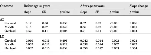 For ΔZ, slopes for all 3 locations were significantly >0 before and after the age of 30 years, indicating that ΔZ increased with age for all 3. The slope change at the age of 30 years was also significant at all 3 locations, i.e., ΔZ increased faster with age after 30 years than before 30 years at all 3 locations. Before the age of 30 years, slopes did not differ significantly etween locations, but after the age of 30 years, the slope was higher for the occlusal third than for the other 2.