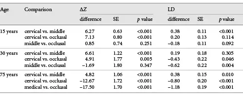 The evaluated locations (cervical, middle, and occlusal) were compared at empirical estimated ages of 15, 30, and 75 years to evaluate the differences throughout the age range considered in this study (Table 2).