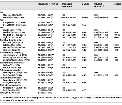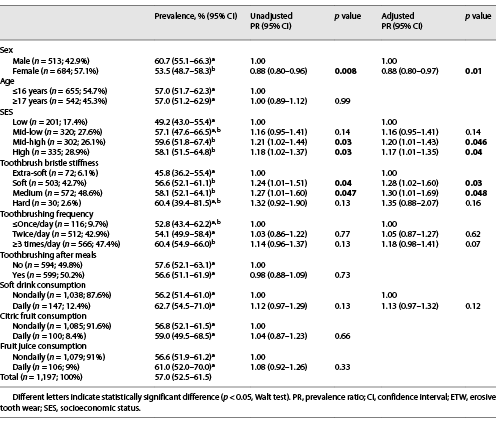 The toothbrush bristle stiffness was associated with ETW prevalence in both unadjusted and adjusted analyses. The final model showed that individuals who used toothbrushes with soft (PR = 1.28, 95% CI = 1.02–1.60) or medium (PR = 1.30, 95% CI = 1.01–1.69) bristles were around 30% more likely to have ETW than those who used toothbrushes with extra-soft bristles. The category hard bristles has not reached statistical significance. In addition, sex (boys) and SES (mid-high and high) were significantly associated with the study outcome.