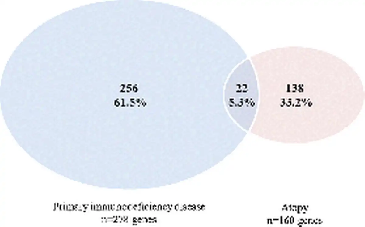 Venn diagram illustrating the overlap of the disease causing genes of monogenic primary immunodeficiency diseases and the atopy‐related genes identified in the Human Gene Mutation Database