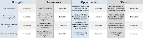 The SWOT analysis reflects the situation of Allergology at a local level. The presence of a full specialty can be considered as a strength in one country, whereas the lack of such a discipline will be seen as a weakness. In some countries, the loss of a full specialty was listed under threats. Other threats included lack of attractiveness of the discipline among young doctors, as well as its weak prioritization by local authorities. Moreover, limited funding opportunities and insufficient reimbursement policies were considerable challenges, and in some countries the reduced availability of immunotherapy products and lack of standardization in this context, were concerns. Notwithstanding, the continuing growth of the discipline, increased allergy awareness and improved prevention measures, as well as ongoing efforts to improve allergy care, were regarded as opportunities. Finally, research and translational medicine to improve patient care and treatment, as well as the investment in young specialists, were considered as opportunities. Local diversity in policy and circumstances may contribute to the diversity in the answers to the questionnaires. Figure 5 displays the most important topics being put forward by representatives of 3 or more countries.