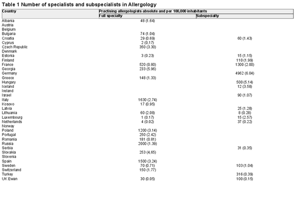 The high prevalence and concomitant burden of allergic diseases requires sufficient health care provisions to meet the needs of allergy patients. In 2006 an EAACI Task Force published a survey on allergy services in Europe [ ]. This report gave an overview of countries having or lacking allergy and clinical immunology services. Moreover, it provided an overview of the availabilities of services covered per country (i.e. allergy, autoimmune disease, immunodeficiency's etc.) Another source of information on allergy services in Europe comprise a survey among 26 European countries done by the UEMS Allergology Section & Board (S&B) [ ]. This survey gives a comprehensive overview on specialties, subspecialties, number of allergologists, training aspects, organization of care, use of immunotherapy, guidelines and Continuing Medical Education (CME).