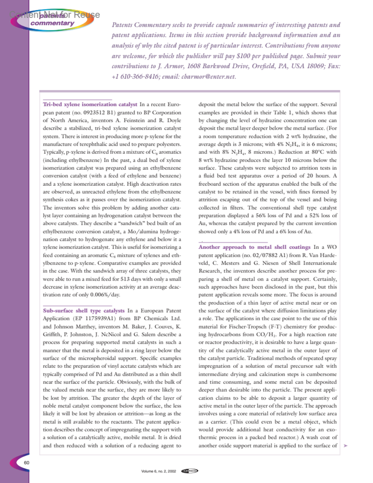 Patents CommentarySomorjai, G.Author informationCatalysis Let ters,76 (2001)1Cattech 6(2):p 60-62, April 2002.Copyright ©2002 Kluwer Academic Publishers