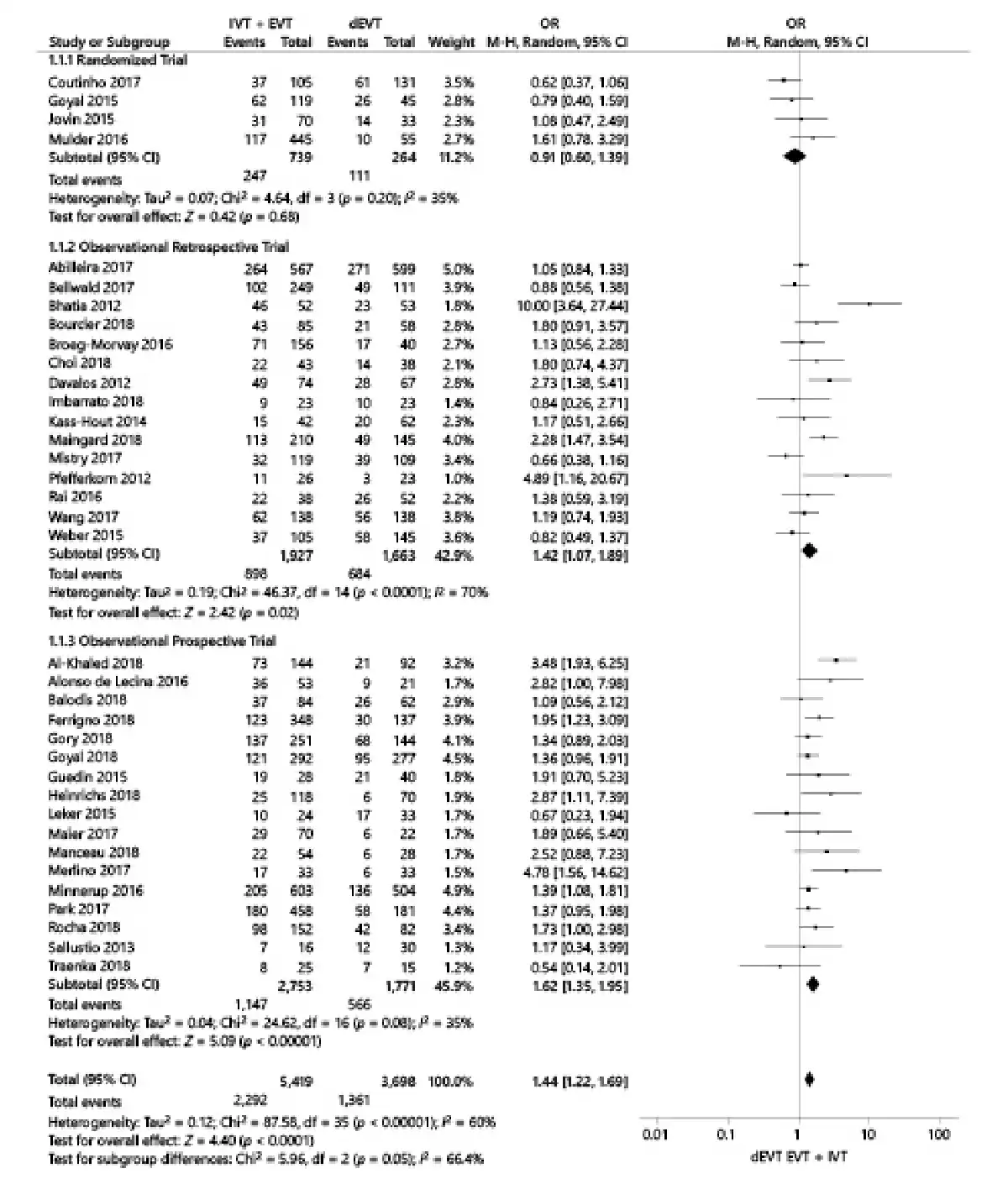 Forest plot for primary endpoint by study types. IVT, intravenous thrombolysis; EVT, endovascular thrombectomy; dEVT, direct EVT.