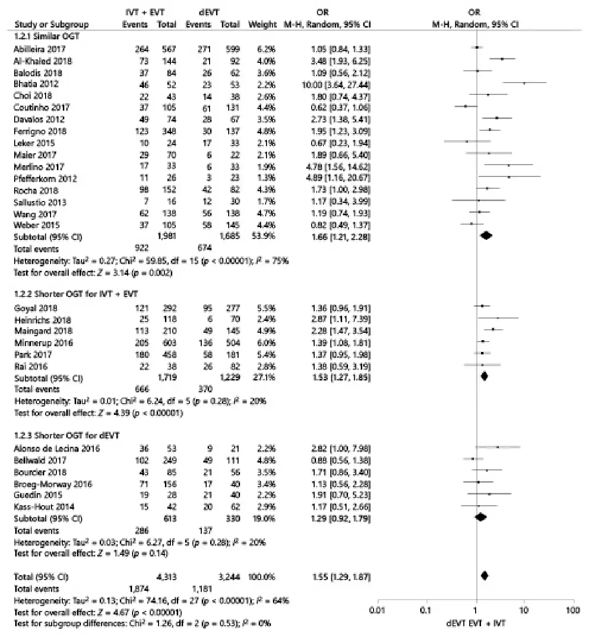 In subgroup analysis depending on differences in onset-to-groin time, the pooled analysis showed better results for bridging therapy versus dEVT (OR 1.55, 95% CI 1.29–1.87, p < 0.001, pheterogeneity<0.001), which was confirmed among studies with similar OGT (OR 1.66; 95% CI 1.21–2.28, p = 0.008) but with high heterogeneity (I2 = 79%; Fig. 3). Among studies with shorter OGT for IVT + EVT (n = 2,948), bridging was superior to dEVT (OR 1.53, 95% CI 1.27–1.85, p < 0.001, pheterogeneity = 0.69). Vice versa, reperfusion strategies had similar outcome (OR 1.29, 95% CI 0.92–1.79) considering studies with shorter OGT for dEVT than bridging therapy (n = 943; Fig. 3).