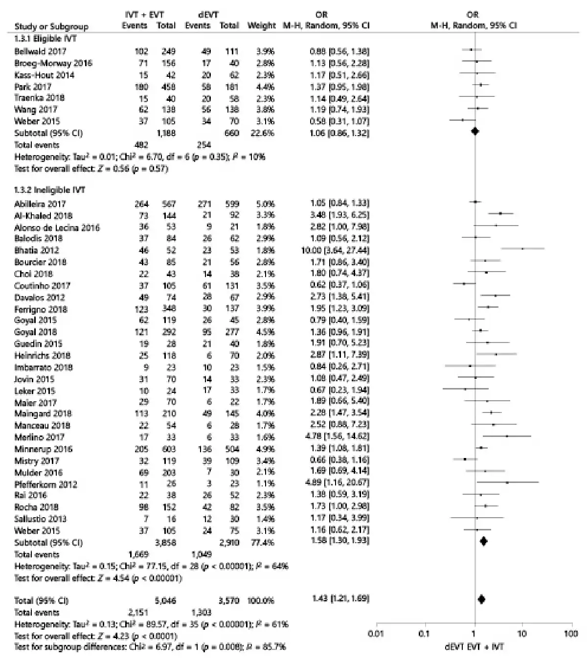 Here we provide a systematic review and pooled data meta-analysis of studies comparing dEVT versus bridging therapy, including subgroup analysis by treatment timing, eligibility to IVT, and study type.