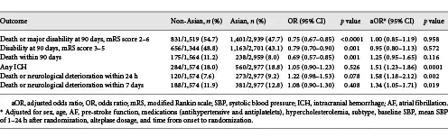 Associations of Asian versus non-Asian regional and functional and safety outcomes were estimated in logistic regression models, with adjustment for key baseline prognostic covariates of age, sex, premorbid function (estimated mRS score 0 vs. 1), use of antithrombotic treatment, history of hypercholesterolemia, atrial fibrillation, current treatment for hypertension, baseline SBP, time from symptom onset to randomization, final diagnosis of AIS subtype, rtPA dose, and mean SBP 1–24 h post-randomization. Data are reported with adjusted odds ratios (OR) and 95% confidence intervals (CIs), with a 2-sided p < 0.05 considered statistically significant. All analyses involved SAS version 9.3 (SAS Institute, Cary, NC) [, ].
