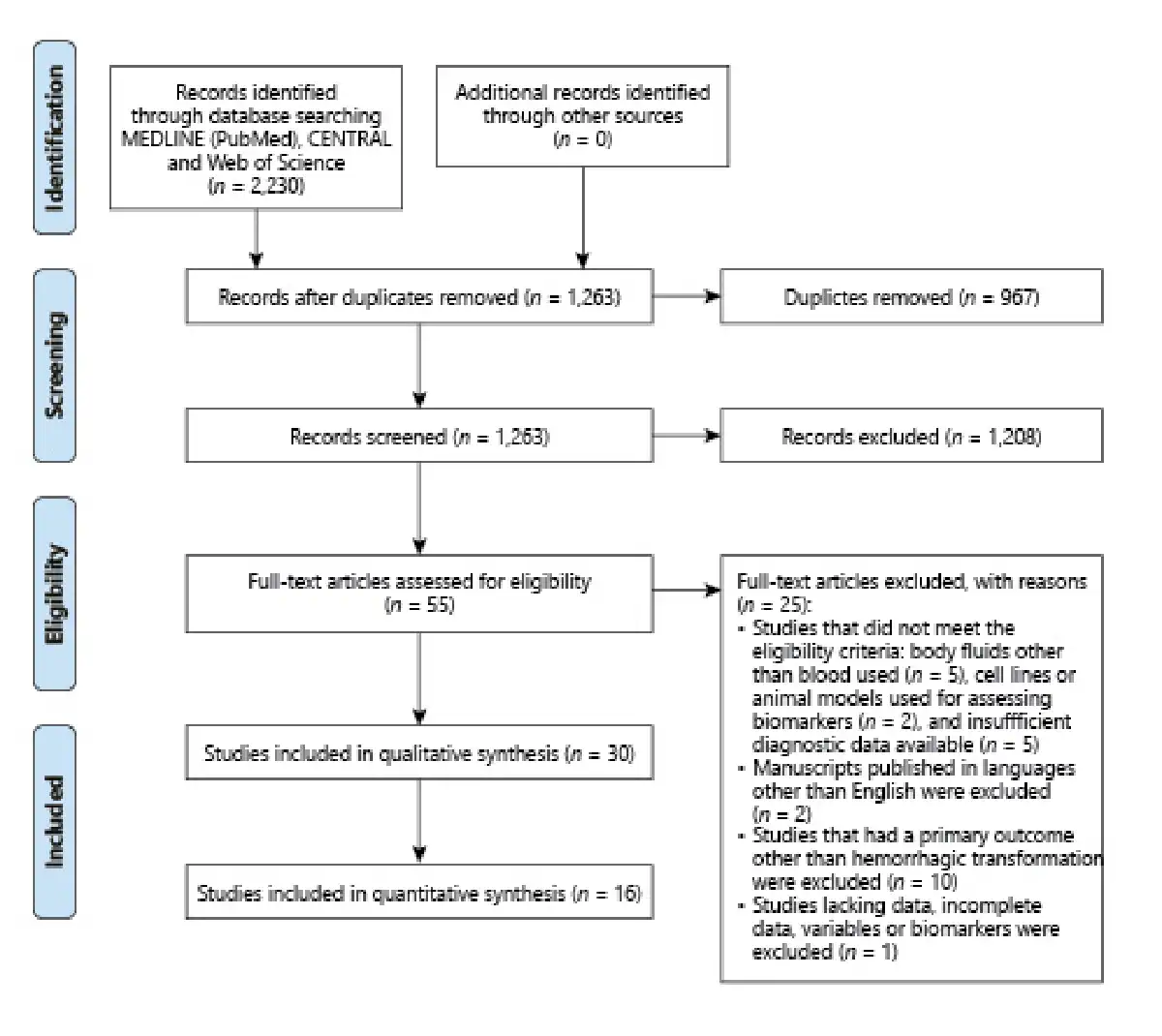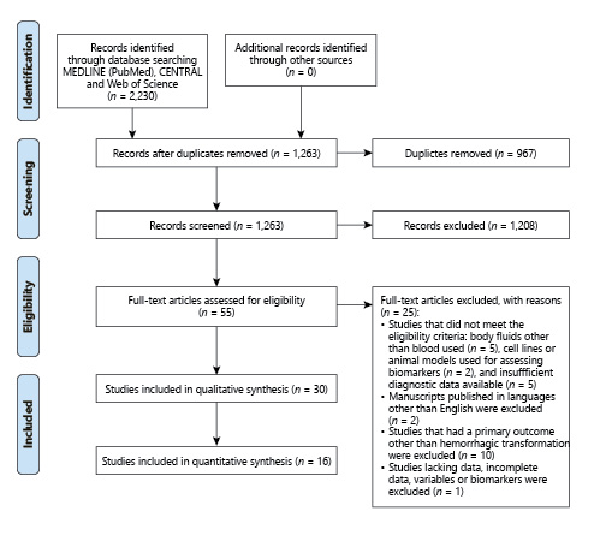 We evaluated biomarkers according to the following outcome measures: (i) comparison of baseline levels of biomarkers in HT and non-HT patients, (ii) biomarker estimation among HT subtypes, (iii) association of biomarker levels in HT post-intervention, and (iv) functional outcome at 90 days from onset, using the modified Rankin scale. The study protocol was registered in the PROSPERO database (reg. no. CRD42020201334) and adhered to Preferred Reporting Items for Systematic Reviews and Meta-Analyses statement [].