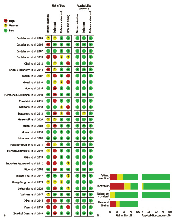 Summary of the risk of biases using QUADAS-2 tool. a Risk of bias summary presenting the risk of bias items for each included study. b Risk of bias graph for all studies presented as percentages. QUADAS-2, Quality Assessment of Diagnostic Accuracy Score-2.