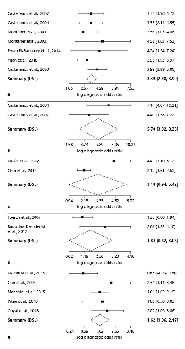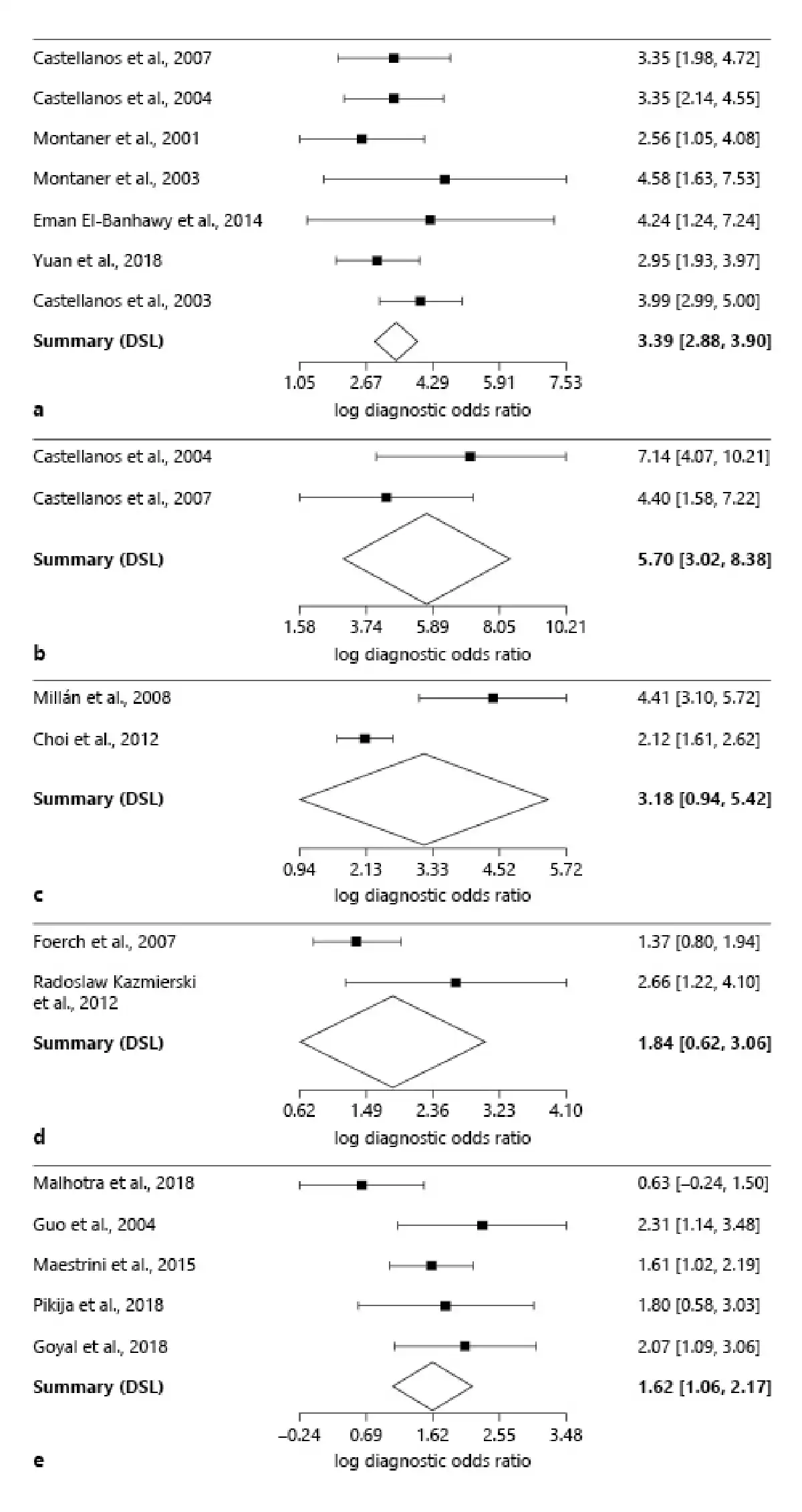 Forest plots of univariate analysis using DORs of meta-analyzed studies: pooled DOR for MMP-9 (a), c-Fn (b), ferritin (c), S100B (d), and NLR (e). MMP-9, matrix metalloproteinase-9; c-Fn, cellular fibronectin; S100B, S100 calcium-binding protein B; NLR, neutrophil-lymphocyte ratio; DORs, diagnostic odds ratios.
