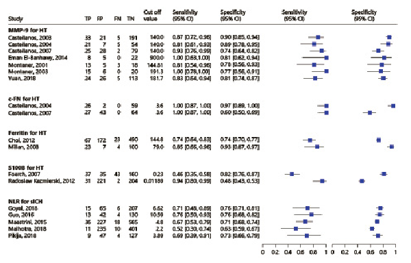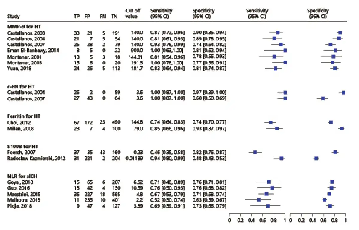The strengths of our review were the availability of individual studies with at least 2 well-studied biomarkers such as MMP-9 and NLR. However, some limitations may affect our findings. Heterogeneity in the patient population, timing of blood samples, whether plasma or serum was used, commercial assay kits, and the reporting of HT subtypes may explain the varying thresholds of MMP-9 and NLR across studies. The pooled analysis conducted in the present study was based on random effects model due to the presence of heterogeneity in cutoff values and varied techniques used as shown in Figure 4. Though heterogeneity is a known feature in diagnostic test accuracy studies, large sample studies are recommended to ascertain diagnostic test accuracies of multiple biomarkers. Also, the pooled analysis of c-Fn and ferritin in the present study were limited due to the availability of only 2 studies for each marker among the included studies. Moreover, some studies did not exclude patients with prior infections, anticoagulant, and antithrombotic use which may influence the severity and frequency of HT and its subtypes. Finally, most of the included studies followed a monocentric design which may limit the generalization of our findings.
