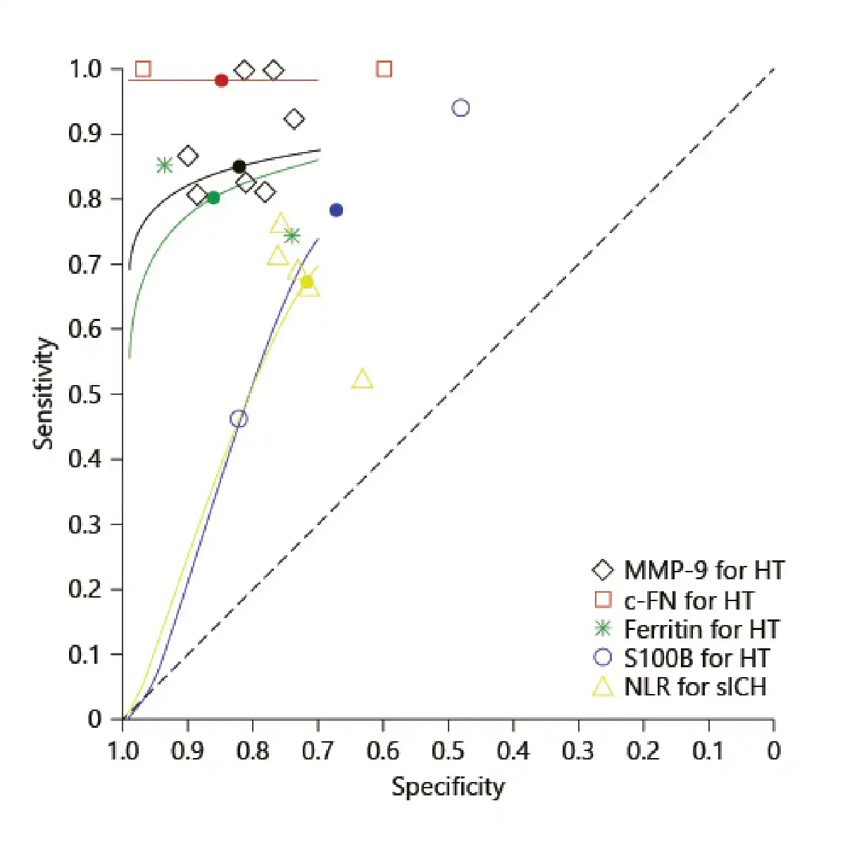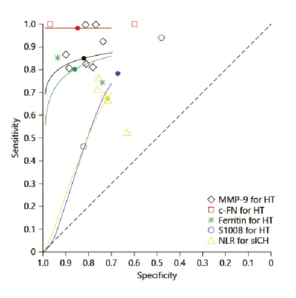 Our meta-analysis included 5 biomarkers, namely, MMP-9, c-Fn, ferritin, and S100B, associated with sHT and NLR with sICH, respectively. MMP-9, which was commonly investigated and evaluated before thrombolysis, increased within 6–8 h after ischemia and was higher in patients who developed sHT, specifically, the PH subtype [, ]. Our meta-analysis showed that patients with MMP-9 levels ≥140 ng/mL had 29.5 times higher risk of developing sHT after stroke. SROC plot comparing the performance of all 5 biomarkers showed a high pooled sensitivity and a low false positivity rate for MMP-9, consistent with previous findings [, ], signifying MMP-9 with higher discriminating ability for predicting sHT risk. In our analysis, the highest sensitivity was obtained for c-Fn and ferritin. In the studies reviewed, serum levels of both markers correlated with each other as well as with MMP-9 levels at 24 h from onset in sHT patients [, ] However, both c-Fn and ferritin generated wide confidence intervals in our meta-analysis thereby affecting their reliability in sHT prediction.