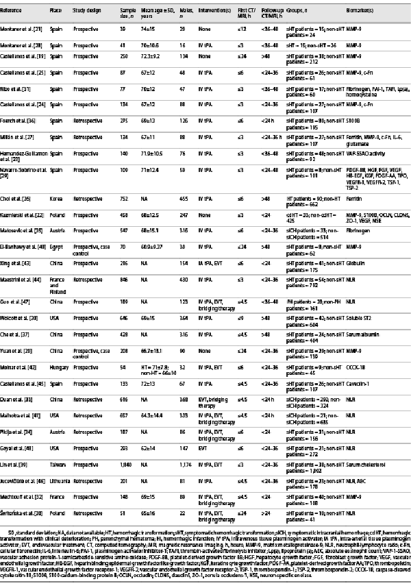 We also reviewed the correlation of markers with short-term outcome, which is closely linked to HT. Baseline levels of MMP-9, ferritin, and NLR were associated with the poor outcome. We found that NLR weakly correlated with sICH indicating low discriminative ability as compared to other markers. Further evaluation may be required for potential biomarkers, caveolin-1, thrombin-activated fibrinolysis inhibitor, plasminogen activator inhibitor-1, and soluble ST2 reported in single studies.
