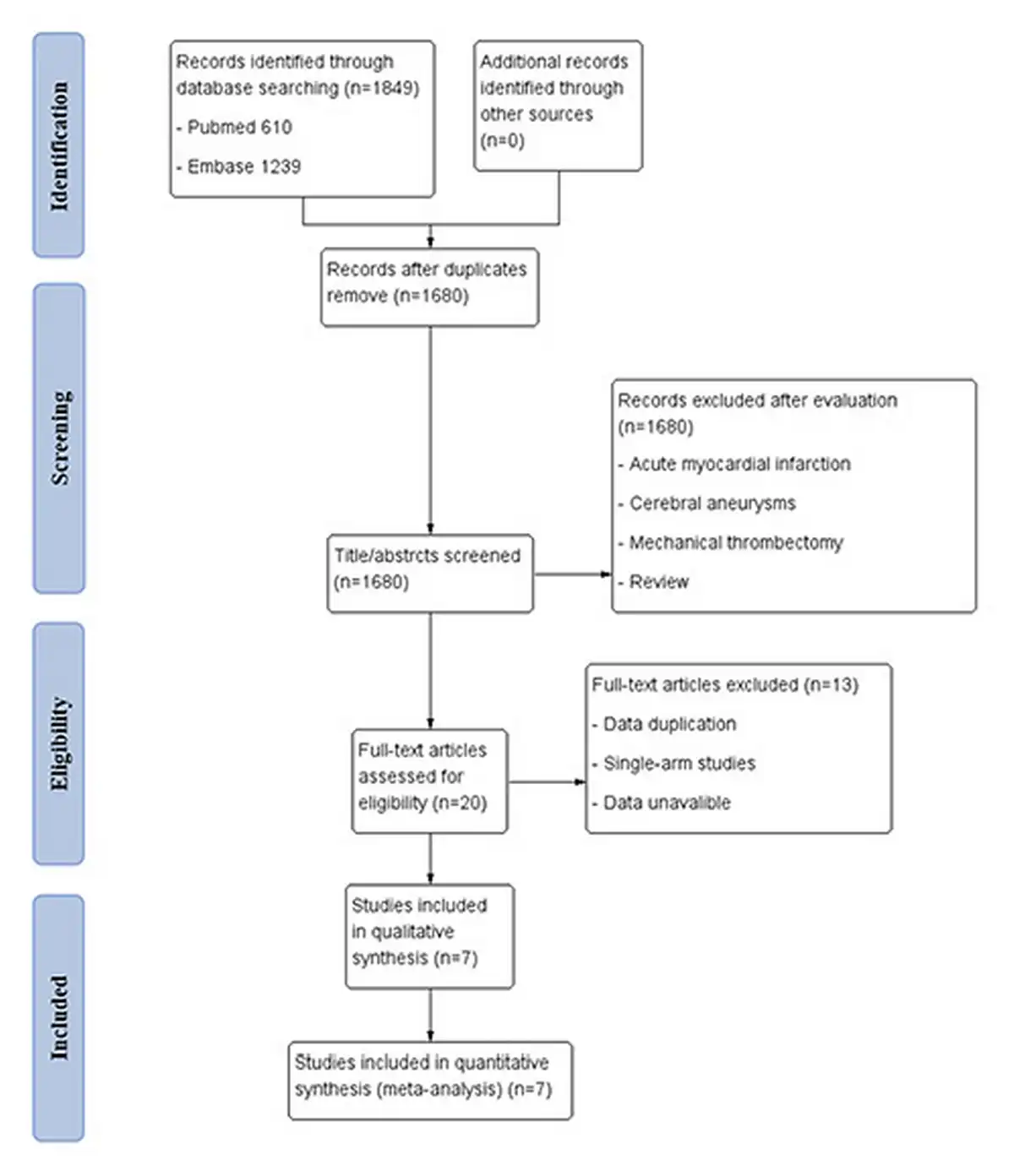 The inclusion criteria of this meta-analysis were as follows: (1) studies comparing tirofiban with non-tirofiban in patients with AIS after IVT treatment; (2) randomized controlled trials (RCTs) or cohort studies; (3) at least one of the following outcomes were reported: sICH, any ICH, mortality and modified Rankin Scale (mRS) score at the 3-month follow-up; and (4) data of studies can be obtained through articles or by contacting authors. The exclusion criteria of this meta-analysis were as follows: (1) studies on acute myocardial infarction; (2) patients with AIS who did not receive IVT; (3) duplicate studies of data; (4) single-arm tests, conference abstracts, review articles, case reports, meta-analyses, and animal studies; and (5) articles from which we could not extract specific data.