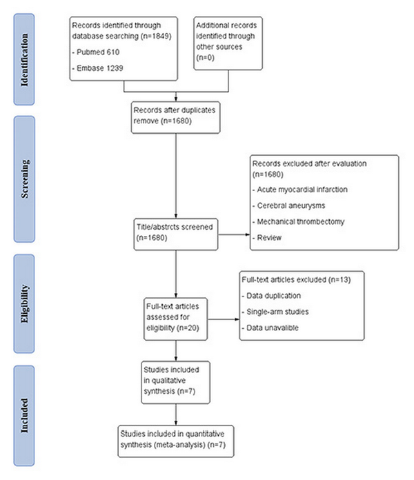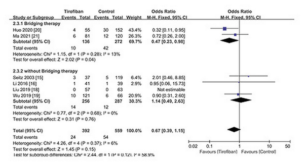 There are several limitations in this meta-analysis. First, our review only included seven studies, including only one RCT. This may increase the risk of bias due to insufficient random sequence generation and blinding. Second, most trials included in this meta-analysis were performed in China and may not be applicable to all ethnic groups. Third, the included studies reported several different IVT strategies, including different dosing methods and dosages. Fourth, there were both anterior and posterior circulation patients in five of these studies. Finally, only two studies were included in the bridging therapy combined with the tirofiban group, and different EVT methods were used, including mechanical thrombectomy, stenting, and balloon angioplasty, so the results should be interpreted with caution. More RCTs are needed to fully clarify the safety and efficacy of tirofiban in patients with AIS receiving IVT.