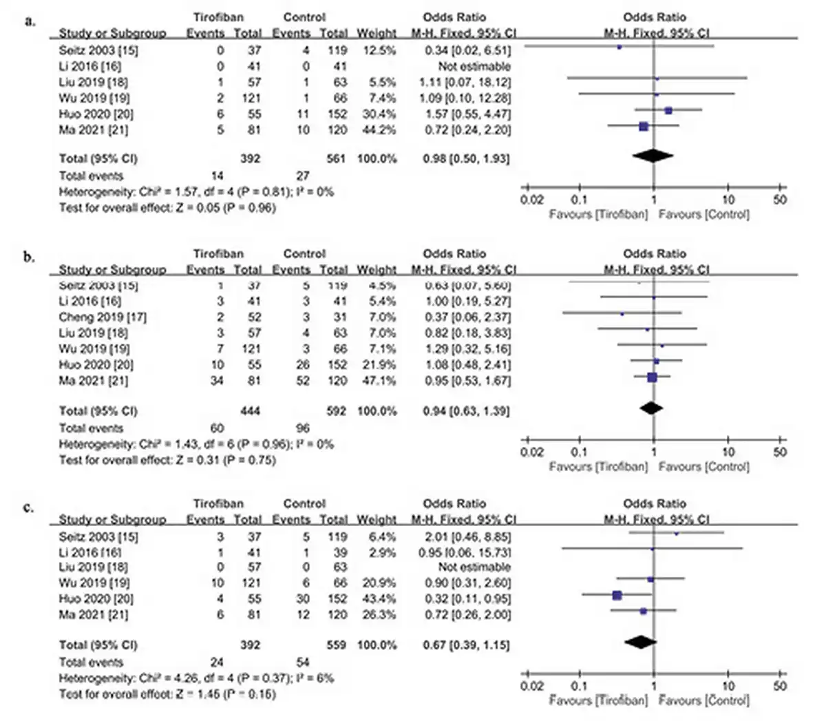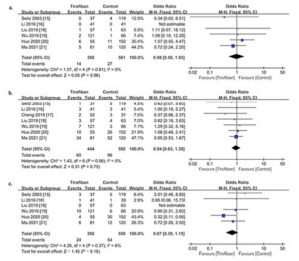 Forest plot of efficacy outcome in patients with and without tirofiban. Safety outcomes include sICH (a), any ICH (b), and mortality (c).