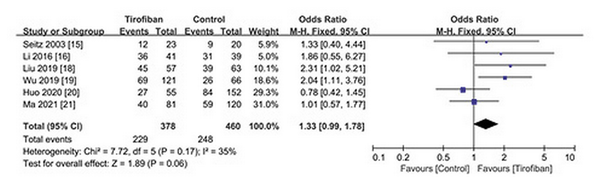 A favorable functional outcome was defined as mRS 0–2 at 3 months in five studies and mRS 0–1 in one study []. The incidence of mRS 0–2 was obtained by contacting the authors. The incidence of overall favorable functional outcomes (mRS 0–2) after IVT was 477 of 838 (57.0%), with 229 of 378 (60.6%) in the tirofiban group and 248 of 460 (53.9%) in the control group. Although there was no statistically significant difference in functional outcomes between the tirofiban group and the control group, it can be seen that the tirofiban group tended to obtain better functional outcomes (OR 1.33; 95% CI 0.99–1.78; p = 0.06) (Fig. 3).