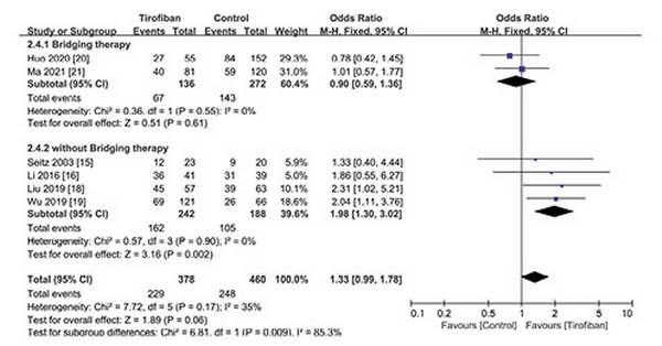 Forest plot of efficacy outcome (favorable functional outcome) in patients with and without tirofiban.