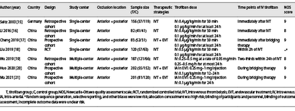 A systematic search was conducted using the PubMed and Embase databases for all English literature published up to and including August 31, 2021. The following keywords were used to retrieve relevant studies: “Tirofiban,” “GP IIb/IIIa receptor inhibitor,” “intravenous thrombolysis,” “recombinant tissue plasminogen activator,” “rt-PA,” and “Alteplase.” Further information on the literature search is available in the online supplementary material.