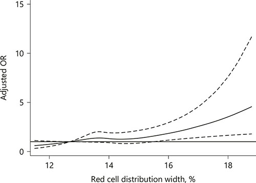 The multiple spline regression analysis to investigate the relationship between RDW and HT. Solid lines represent the odds ratio of HT and dotted lines represent the corresponding 95% CI. ORs were adjusted for variates within p < 0.1 in univariate analysis. OR = 1 was set as the reference line.