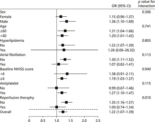 As shown in Figure 2, in subgroup analyses stratified by sex, age, hyperlipidemia, atrial fibrillation, stroke severity and antiplatelet, the modest positive correlations between RDW and HT were observed in all subgroups and reached statistical significance in several subgroups. The association between RDW and HT could be modified by reperfusion therapy (p for interaction = 0.010). Among patients who had not received reperfusion therapy, RDW had a significant positive correlation with HT (OR 1.35, 95% CI 1.16–1.57, p < 0.001). However, this correlation attenuated and became insignificant when limiting the analysis to patients who had received reperfusion therapy (OR 1.00, 95% CI 0.74–1.34, p = 0.980).