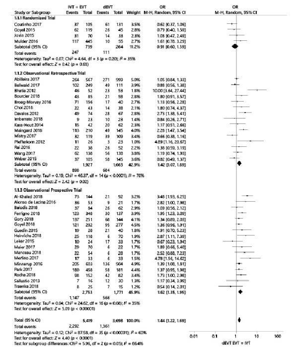 Forest plot for primary endpoint by study types. IVT, intravenous thrombolysis; EVT, endovascular thrombectomy; dEVT, direct EVT.