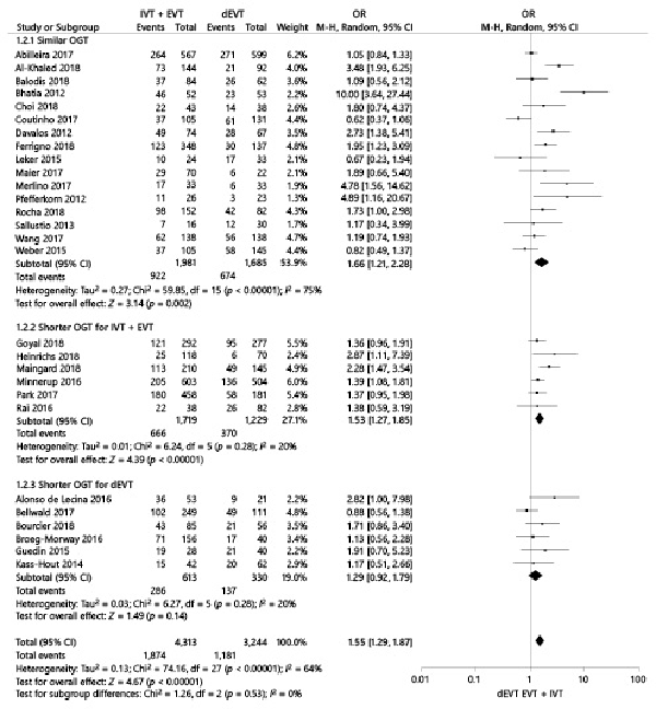 In subgroup analysis depending on differences in onset-to-groin time, the pooled analysis showed better results for bridging therapy versus dEVT (OR 1.55, 95% CI 1.29–1.87, p < 0.001, pheterogeneity<0.001), which was confirmed among studies with similar OGT (OR 1.66; 95% CI 1.21–2.28, p = 0.008) but with high heterogeneity (I2 = 79%; Fig. 3). Among studies with shorter OGT for IVT + EVT (n = 2,948), bridging was superior to dEVT (OR 1.53, 95% CI 1.27–1.85, p < 0.001, pheterogeneity = 0.69). Vice versa, reperfusion strategies had similar outcome (OR 1.29, 95% CI 0.92–1.79) considering studies with shorter OGT for dEVT than bridging therapy (n = 943; Fig. 3).