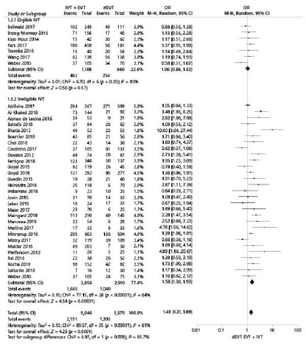 Forest plot for primary endpoint considering studies with patients eligible or not to IVT. IVT, intravenous thrombolysis; EVT, endovascular thrombectomy; dEVT, direct EVT.