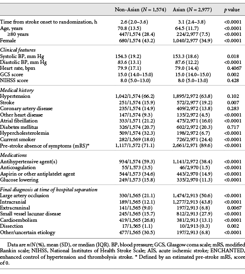 It is widely acknowledged that the characteristics, management, and outcomes for patients with acute ischemic stroke (AIS) vary across the world []. In Asia, where two-thirds of global stroke deaths occur, the burden of AIS is particularly heavy as patients are relatively young and have challenges accessing evidence-based care [-]. The effectiveness of early reperfusion therapy with intravenous thrombolysis for AIS is well established [], but most of the randomized evidence has been derived from Caucasian populations []. Few studies have examined the high frequency of intracranial atherosclerosis and cerebral small vessel disease, and an apparent greater risk of intracranial hemorrhage (ICH), influence outcomes in thrombolyzed Asian AIS patients. Herein, we present analyzes of how differing demographic, clinical, and management variables between Asian and non-Asian thrombolyzed AIS patients are associated with clinical outcomes in the Enhanced Control of Hypertension and Thrombolysis Stroke study (ENCHANTED).