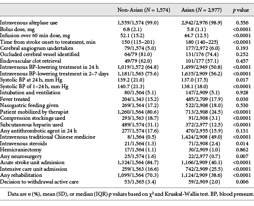 Table 2 highlights differences in the use of intravenous alteplase and early in-hospital management, where overall Asian patients received a lower dose of alteplase, both bolus and infusion, mainly due to having a lower body weight, and it was administered at a later time from symptom onset (180 min vs. 150 min, p < 0.0001, Table 2) compared to non-Asians. Although there was less use of BP-lowering treatment, Asians had a greater reduction in achieved mean SBP over 24 h than non-Asians (138.1 mm Hg vs. 140.7 mm Hg; p < 0.0001, Table 2). Asian patients also had lower admission to an acute stroke unit and use of venous thromboembolism prophylaxis, neurosurgery, mobilization by therapist and rehabilitation, and withdrawal of care measures but were more likely to receive intensive care, anti-pyrexia treatment, intravenous steroids, and traditional Chinese medicine, than non-Asians.