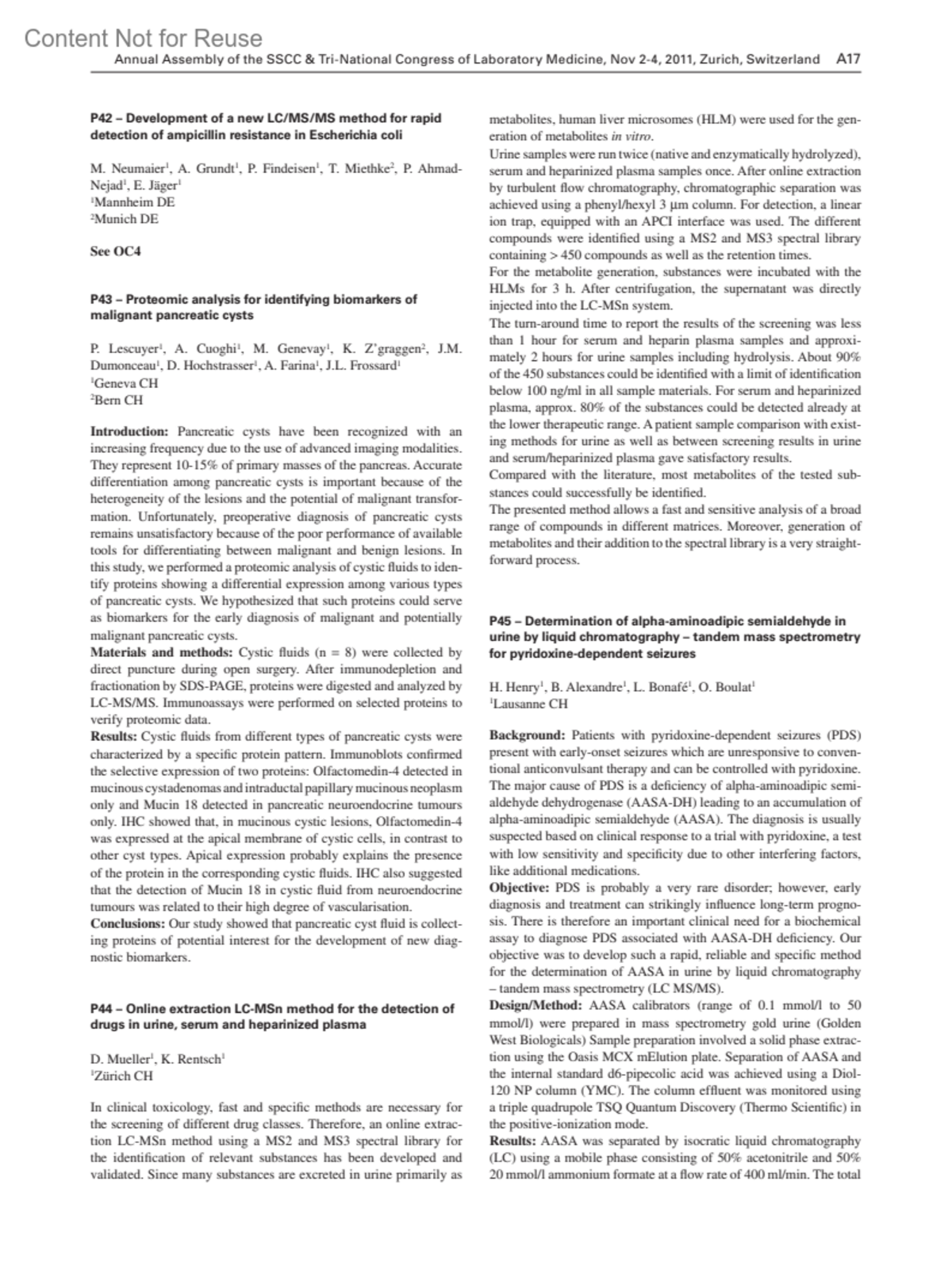 Online extraction LC-MSn method for the detection of drugs in urine, serum and heparinized plasmaP44Mueller, D.Rentsch, K.Author information1Zürich CHClinical Chemistry and Laboratory Medicine 49(10):p A17, October 2011.Copyright © 2011 Walter de Gruyter