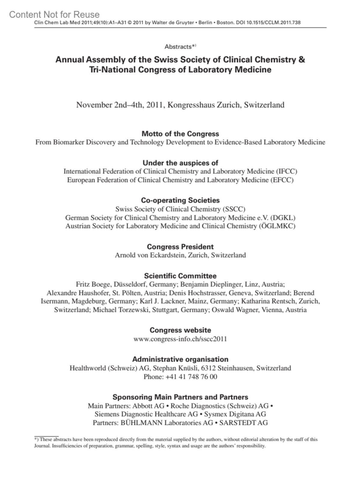 Clinical Chemistry and Laboratory Medicine 49(10):p A9, October 2011.