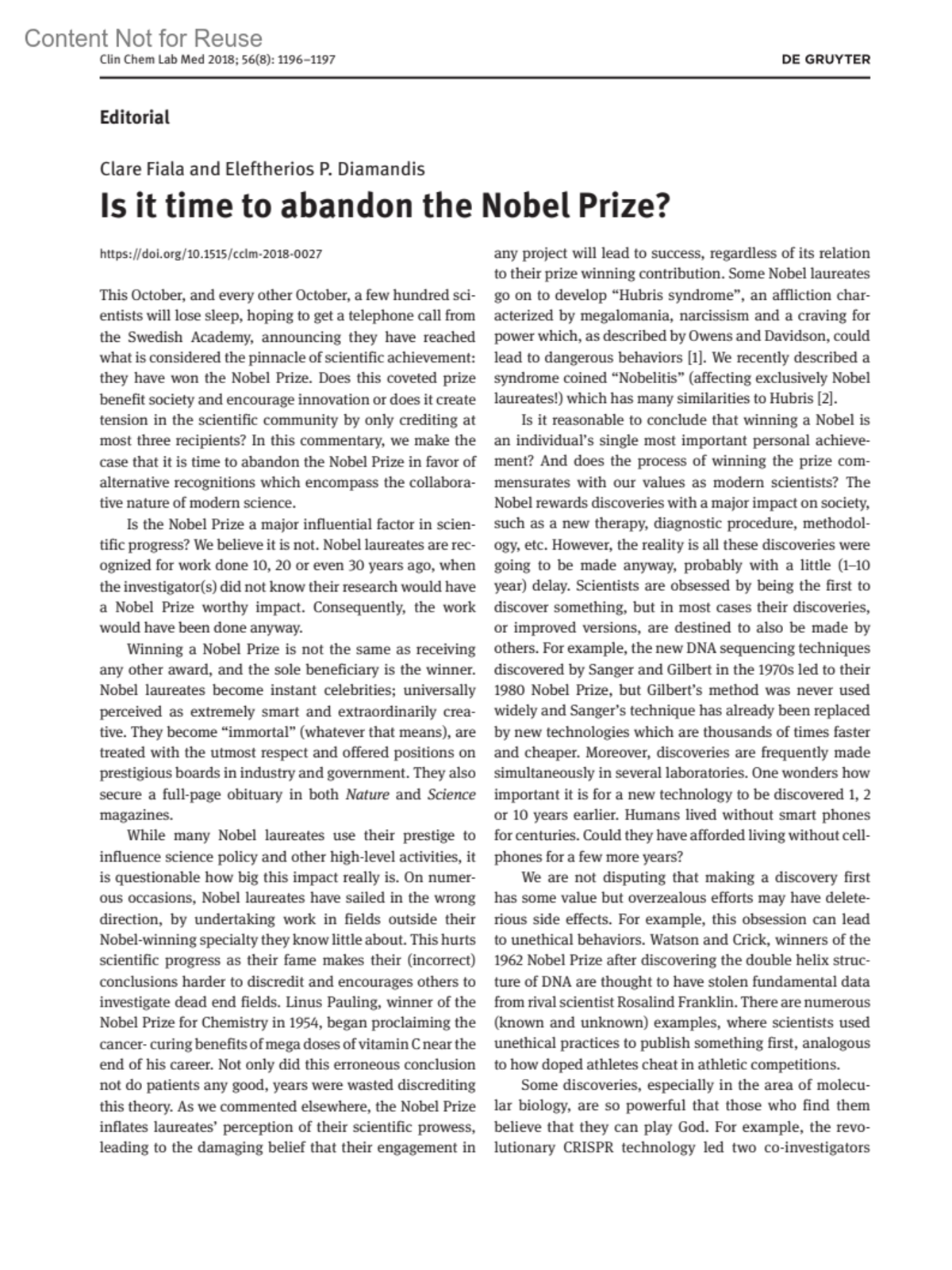 Corresponding author: Eleftherios P. Diamandis, MD, PhD, FRCP(C), FRSC, Head of Clinical Biochemistry, Department of Clinical Biochemistry, University Health Network, 60 Murray St. Box 32, Floor 6, Rm L6–201, Toronto, ON, MST 3L9, Canada, Phone: +(416) 586–8443; Department of Pathology and Laboratory Medicine, Mount Sinai Hospital, 60 Murray St. Box 32, Floor 6, Rm L6–201, Toronto, ON, MST 3L9, Canada; and Department of Laboratory Medicine and Pathobiology, University of Toronto, Toronto, ON, Canada
