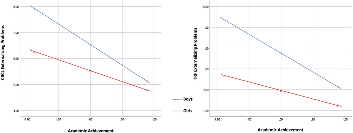 Plot of the interaction between child gender and academic achievement in relation to child’s externalizing problems reported on CBCL and on TRF.