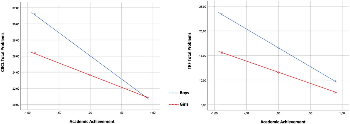 Plot of the interaction between child gender and academic achievement in relation to child’s total problems reported on CBCL and on TRF.