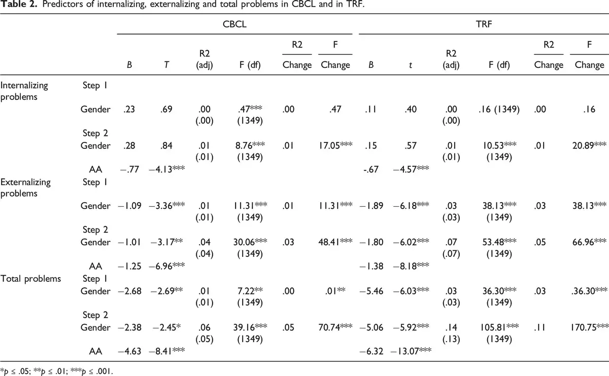 Regarding parents’ reports, gender predicted externalizing and TP. In both cases, gender explains 1% of the total variance. However, when AA is added to the model, it predicts internalizing, externalizing and TP. These results indicate that AA is a predictor of interest to understand EBP, given that, for IP, it adds 1% to the explained variance in EBP, and it also adds 3% to the explained variance for EP and 5% for TP assessed by parents (see Table 2).