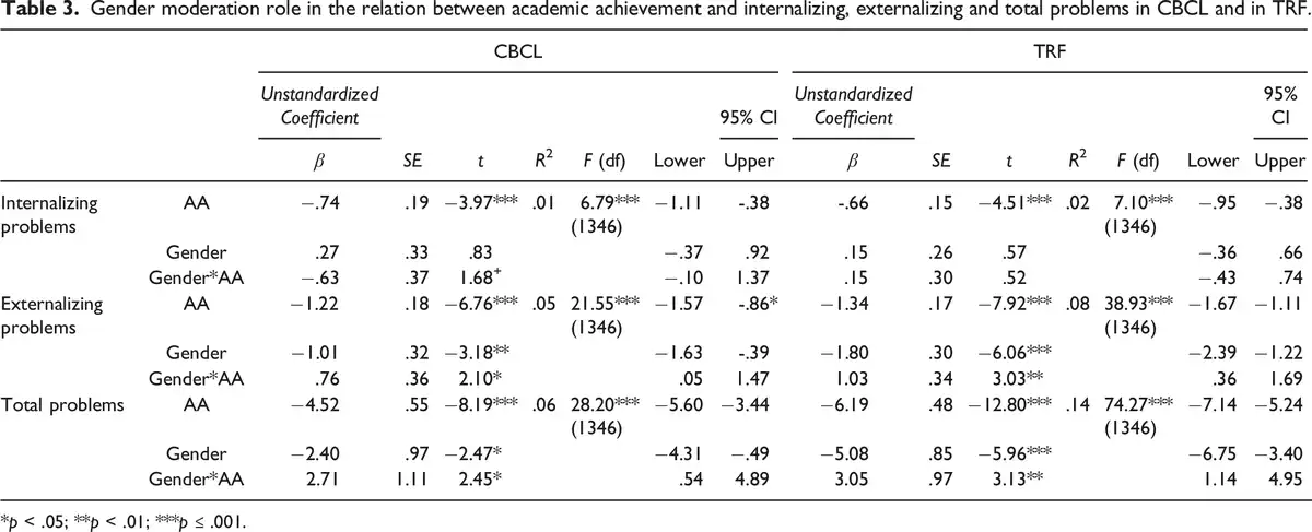 The moderation role of gender in the relation between academic achievement and internalizing, externalizing and total problems