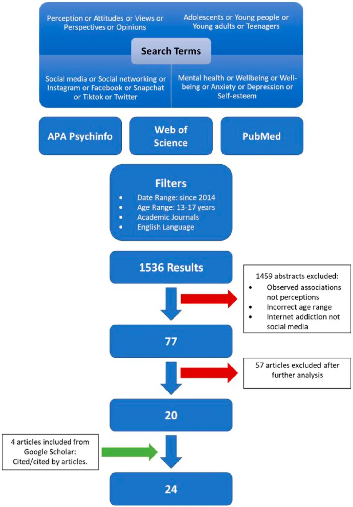 Searches were conducted using APA PsychInfo, Web of Science Core Collection and PubMed. Search terms are shown in Figure 1. Initial search results were screened to exclude quantitative studies, and those about internet use more broadly. Studies of social media use during the COVID-19 pandemic were excluded due to the complexity of factors involved, including confounding factors for mental health. Papers that included a significant proportion of the 13–17 target age group but also included comparison to slightly younger or older age groups, were included, with analysis focused on the target age range within the study sample. Full text of 77 papers was reviewed and 57 excluded due to not meeting inclusion criteria. Twenty papers were selected for inclusion; an additional four papers were identified from searches of reference lists and citation searches (see Figure 1).