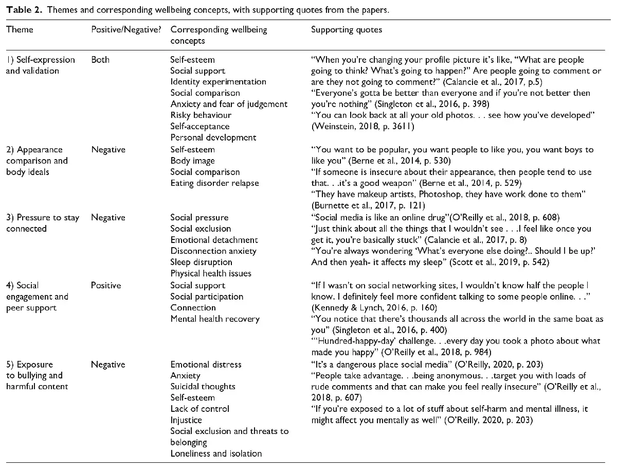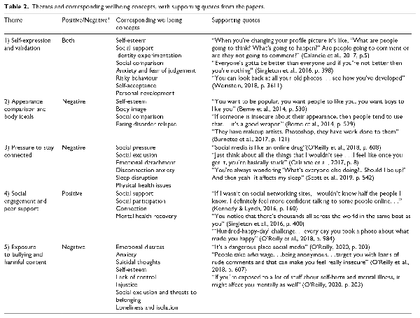 Five themes were identified, describing the mechanisms through which social media impacts on mental health and wellbeing: self-expression and validation; appearance comparison and body ideals; pressure to stay connected; social engagement and peer support; and exposure to bullying and harmful content. Themes and corresponding mental health/wellbeing concepts identified from included papers, with supporting quotes, are given in Table 2. Notably, adolescents reported a mixture of direct personal experiences and emotions associated with their own social media use, as well as general third-person views on its effects on the adolescent population. This is highlighted by the range of quotes, with some reflecting stances towards social media, and others describing effects of the platforms on their own mental health.