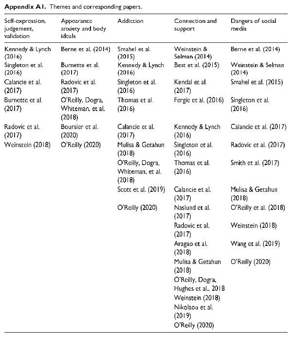 Importantly, there was significant interplay between the five emerging themes, reflecting the complexity of factors at play. For instance, found that although online connection was positive, it resulted in the need to stay informed about others’ lives, which led to compulsive use of the sites in fear of not knowing. Similarly, in the study by , adolescents admitted that the positive connection aspect quickly turned into reliance on social media to stay connected, fuelling addiction. This issue of disconnection anxiety was also highlighted in other studies (; ). Furthermore, although self-expression was reported as hugely positive, there was constant fear of judgement and strict adherence to ‘virtual norms’ to protect against this (; ). In addition, the expectation to share was a heavy burden; some would prefer to keep their lives private and only accept close friends on their profiles, but feared judgement from others regarding numbers of online friends (). In this way, the reported positive and negative aspects of social media had an inter-related effect on the way in which adolescents used and felt about the sites.
