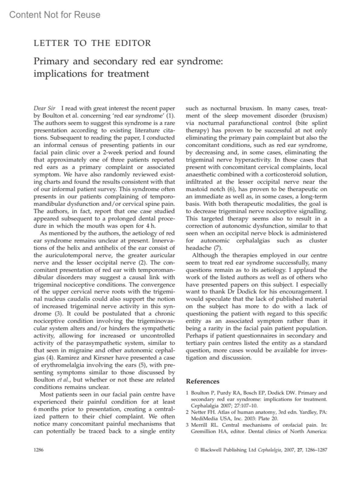 Primary and secondary red ear syndromeimplications for treatmentDodick, DavidAuthor informationDepartment of Neurology, Mayo Clinic, 13 400 E. Shea Blvd, Scottsdale, AZ 85259, USA. E-mail: [email protected]Cephalalgia 27(11):p 1287, November 2007.Copyright © 2007 Blackwell Publishing Ltd.