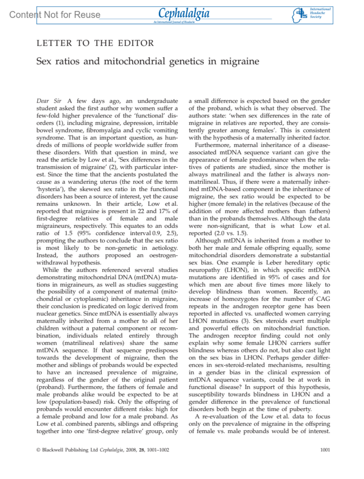 Sex ratios and mitochondrial genetics in migraineLow, N C MD, MScAuthor informationAssistant Professor, Department of Psychiatry, McGill University, 1033 Pine Ave West, Montréal, Québec H3A 1A1, Canada.Tel. + 1 514 465 9033, e-mail [email protected]Cephalalgia 28(9):p 1002, September 2008.Copyright © 2008 Blackwell Publishing Ltd.