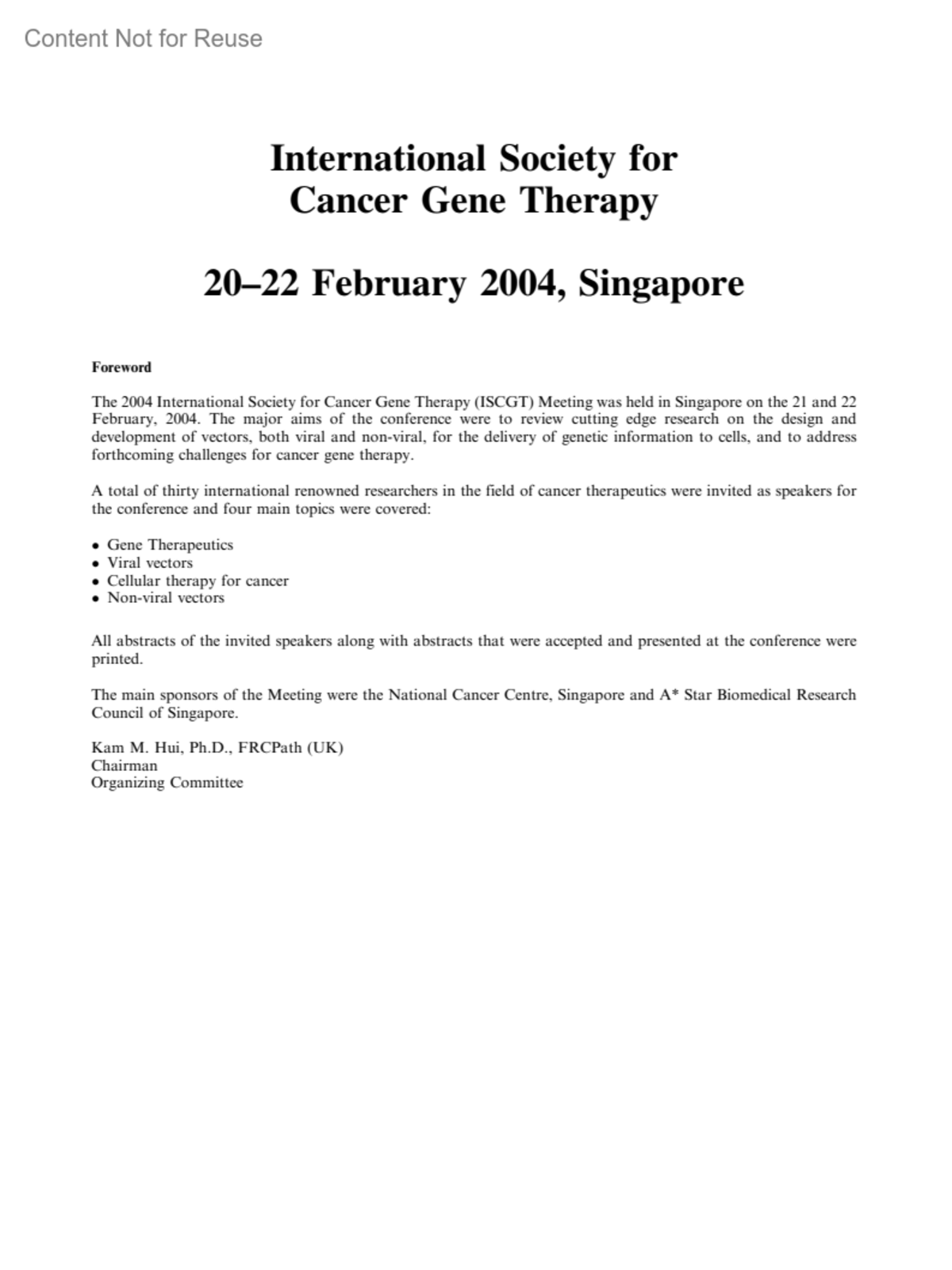 International Society for Cancer Gene Therapy 20-22 February 2004, SingaporeHui, Kam M. Ph.D., FRCPath (UK)Author informationChairman; Organizing CommitteeCancer Gene Therapy 11(12):p 841, December 2004.Copyright © 2004 Nature Publishing Group